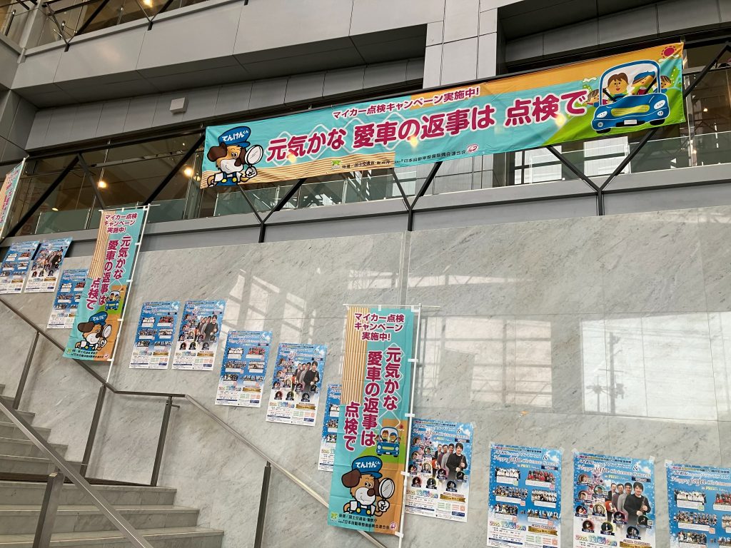 会場入口のホールから多くのてんけんくんや、マイカー点検キャンペーンのスローガンが記載された「のぼり」やポスターが掲示されており、自動車整備関連のイベントであることが強く印象付けられた。