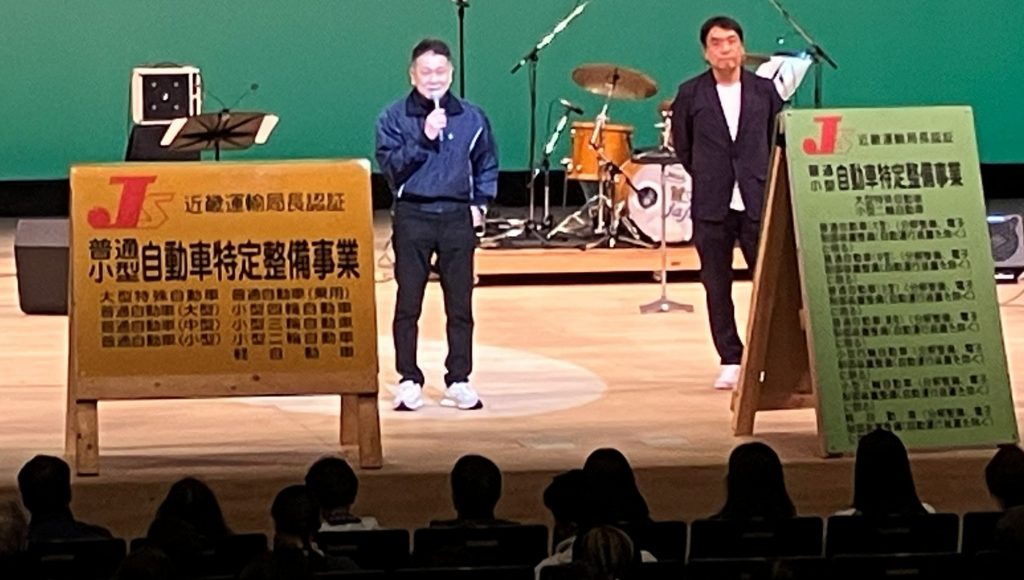 午後の部においても、演奏開始に先立ち、地区役員の方々が自動車整備に関するプレートをもって登壇され、辻︊会長より挨拶が行われた。